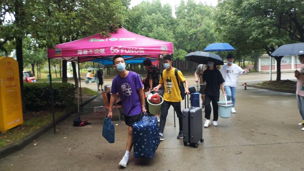 沉沉的行李箱中,装载的是家人的无限关心与期许。由于疫情防控需要,家长不能进入校园,一个人面对小山般的行李怎么办?不用担心,公司苦干团、员工会干部、志愿者早早地做了充足的准备,从校门口到1C宿舍楼报到点,贴心的指引和帮助,让小萌新们能够有序、及时地完成入学手续的办理。“印象最深的就是帮忙的学长学姐们,大家都很热情,每个人都提了很多东西,冒着大雨,帮我们顺利入住寝室。”小萌新们从他们身上感受到满满的志愿服务精神。