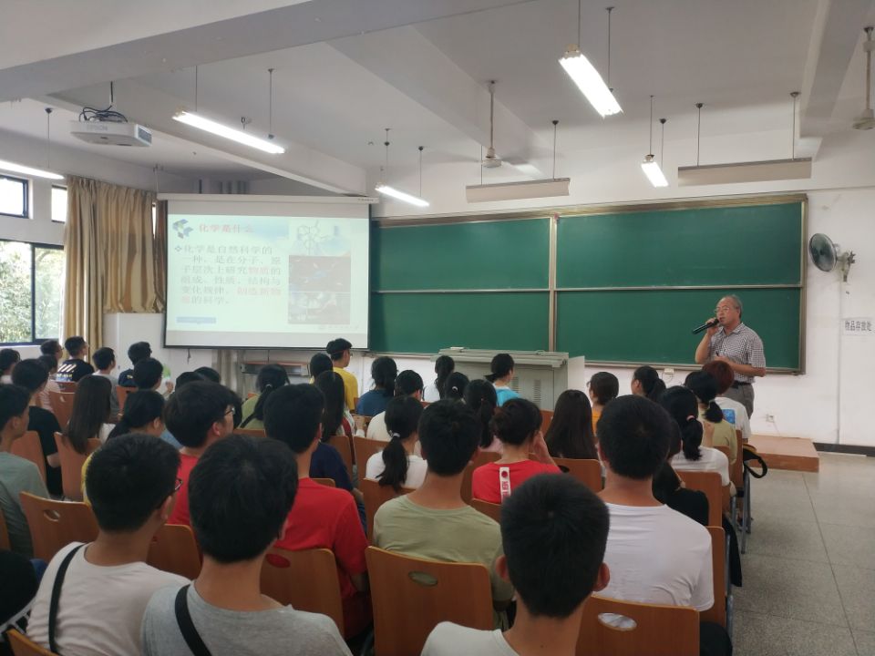 如果你以为这是辅导员老师给新生们做的军训动员讲话,那就错了,这其实是永乐高“教授开讲啦”第二讲的讲座现场,公司刘慧宏教授正在带领新生一起探寻生活中的化学。