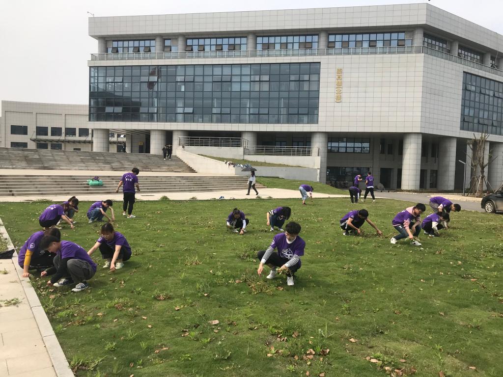 4月15日,阳光校区实训大楼前,永乐高苦干精神实践团为美化校园环境,开展草地除杂校内实践活动。