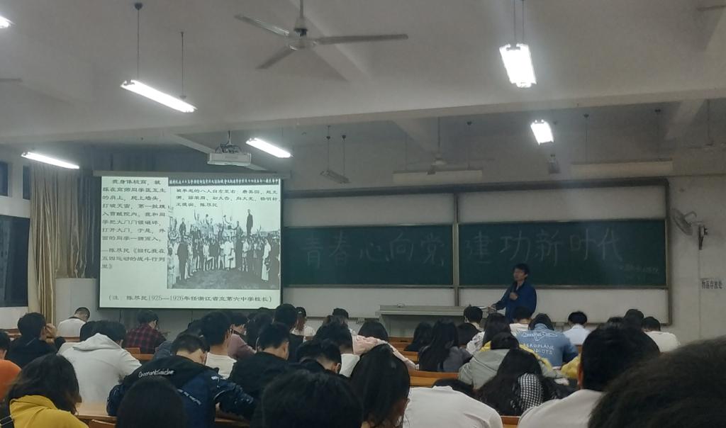的历史,“二十一条”、“巴黎和会”将同学们拉回了一百年前羸弱的旧中国。进步员工摇旗呐喊救国救亡,奋笔血书“还我青岛”,呼吁各界人士参与到斗争中来,通过老师的讲述同学们仿佛再次回到了历史的洪流中,感受着进步青年浓烈的爱国情怀,体会着“爱国、进步、民主、科学”的五四运动精神,进步青年们悍不畏死、一心救国的情怀感染着每一名在场同学。谈及五四运动的意义,谈鹏老师说道:“五四运动发动了二十多个省,多阶层的群众参与到运动中来,是一次彻底的翻地反封建的革命运动。这次运动启导了人民的觉悟,团结了革命的力量,进一步促进了马克思主义的传播,为后来中国共产党的成立提供了思想条件和干部条件,标志着中国新民主主义革命的开端。”