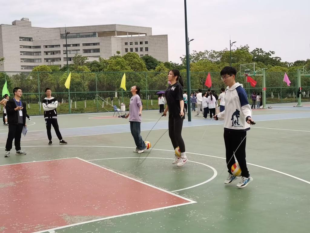 在庄严的国歌声中,第八届“绳运会”正式拉开帷幕。本次绳运会分为教工组和员工组,教工组项目有10人“8”字跳、3×30秒单摇接力、编花跳、大闯关;员工组除以上项目之外也包括8人长绳集体跳、3×30秒双摇接力、一分钟夹球跳以及30秒两人一带。随着裁判的一声令下,绳子甩出划出完美的弧线,一个,两个,三个……参赛者们口中喊着节奏,合并双腿,弯腰躬身,以完美的姿势通过。即便中途有一些小小的失误,也不影响参赛队伍们的脚步,他们相互鼓励,以沉着冷静的姿态来面临失误。随着时间的流逝,在绳子与地面的敲打声中,大家都成功完成比赛。